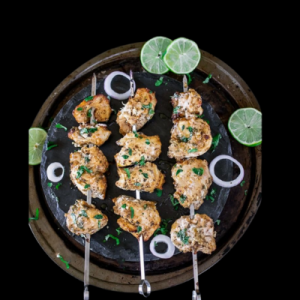 Chicken morsels marinated in yogurt, very mild spices & cashew grilled in oven