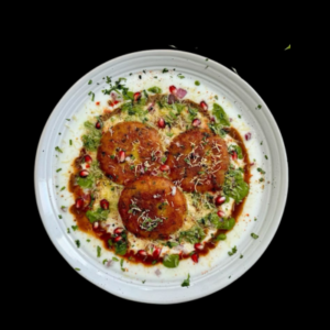 Soft lentil fritters drenched in creamy yogurt and chutneys. Garnished with and coriander.
