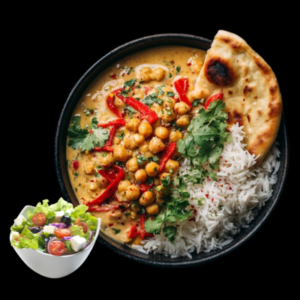 Delhi Channa Masala with Naan, Rice and Salad